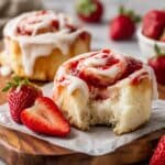 Keywords: strawberry cheesecake cinnamon rolls, Cinnabon style rolls, cheesecake filling cinnamon rolls, strawberry topped cinnamon rolls, sweet breakfast rolls