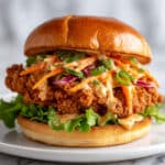 Keywords: Thai fried chicken sandwich, curry chicken sandwich, Thai sandwich recipe, crispy chicken sandwich, deep fried chicken, Thai chili mayo sandwich