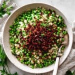Transfer the peas mixture to a large serving bowl. Top with the remaining crispy pancetta and a sprinkle of fresh lemon zest for an inviting burst of citrus aroma. Now your Thanksgiving Peas with Pear and Pancetta Recipe is ready to shine on your table!