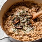 Yes! Substitute the bone broth with vegetable broth, use vegan butter and olive oil instead of butter, and omit the Parmesan or use a vegan cheese alternative. The mushrooms will still provide a rich, satisfying flavor.