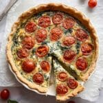 A delicious and wholesome Vegan Tomato Spinach Quiche featuring a flaky homemade pastry crust, roasted cherry tomatoes, and a creamy silken tofu and chickpea flour filling infused with fresh herbs and nutritional yeast. Perfect as a savory plant-based meal that’s both satisfying and nutritious.