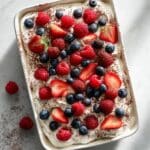 Full rectangular white baking dish filled with a fluffy whipped cream dessert topped generously with fresh whole raspberries, whole blueberries, and halved strawberries, lightly dusted with cocoa powder, presentation styled on a white marble countertop with natural lighting from a 3/4 angle, professional food magazine hero shot, photo taken with an iphone --ar 4:5 --v 7