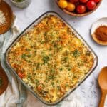 It is mostly vegan-friendly! Just swap the Parmesan cheese topping for a vegan alternative or nutritional yeast, and you’re good to go without losing any of the savory punch.