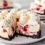 Keywords: white chocolate cheesecake, raspberry cheesecake, Oreo crust cheesecake, creamy cheesecake, homemade cheesecake dessert